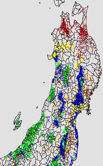 各種文献などを参考にして、分げつ形成に関する限界温度を平均気温で15℃と設定し、15℃以上については1℃刻みで表示します。過去7日の移動平均値で示す。分げつの形成が遅延すると予想される地域を監視するものです。