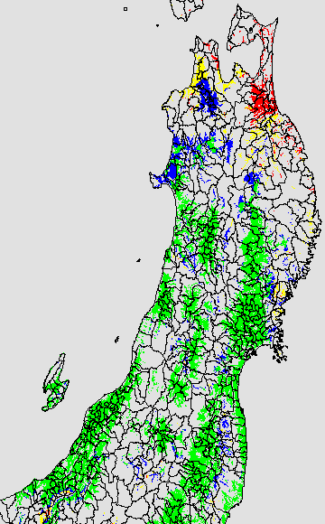 各種文献などを参考にして、分げつ形成に関する限界温度を平均気温で15℃と設定し、15℃以上については1℃刻みで表示します。過去7日の移動平均値で示す。分げつの形成が遅延すると予想される地域を監視するものです。