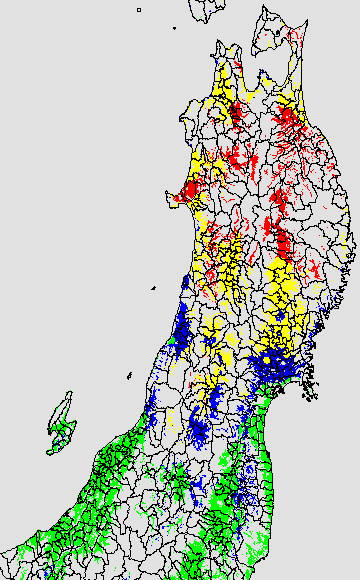 登熟停止が懸念される最低気温として、八柳(1960)は10℃を設定している。それを基に、極端な低温が来た地域の移り変わりを、最低気温の前3日の移動平均値で図示する。