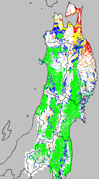 各種文献などを参考にして、草丈・根の伸長に関する限界温度を平均気温で13℃と設定し、13℃以上については1℃刻みで表示します。過去7日の移動平均値で示す。草丈や根の伸長が遅延すると予想される地域を監視するものです。