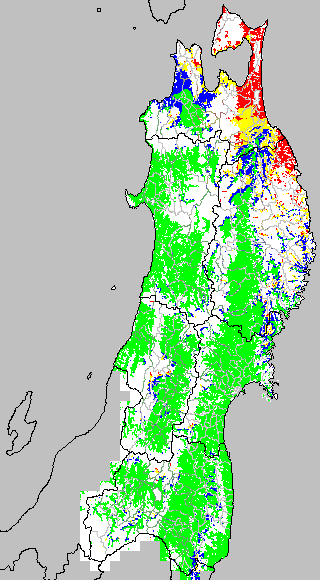 各種文献などを参考にして、草丈・根の伸長に関する限界温度を平均気温で13℃と設定し、13℃以上については1℃刻みで表示します。過去7日の移動平均値で示す。草丈や根の伸長が遅延すると予想される地域を監視するものです。