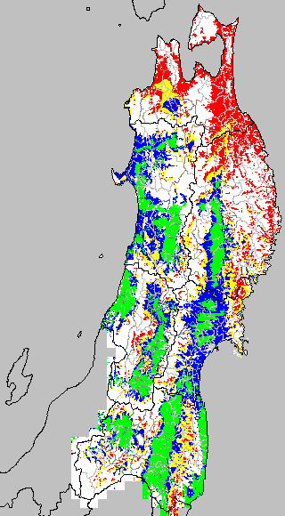 各種文献などを参考にして、分げつ形成に関する限界温度を平均気温で15℃と設定し、15℃以上については1℃刻みで表示します。過去7日の移動平均値で示す。分げつの形成が遅延すると予想される地域を監視するものです。