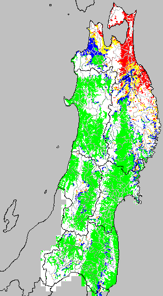 各種文献などを参考にして、草丈・根の伸長に関する限界温度を平均気温で13℃と設定し、13℃以上については1℃刻みで表示します。過去7日の移動平均値で示す。草丈や根の伸長が遅延すると予想される地域を監視するものです。