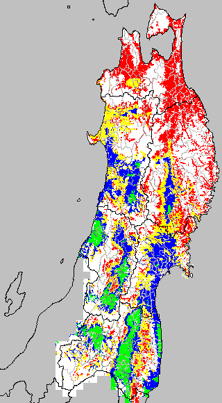 各種文献などを参考にして、分げつ形成に関する限界温度を平均気温で15℃と設定し、15℃以上については1℃刻みで表示します。過去7日の移動平均値で示す。分げつの形成が遅延すると予想される地域を監視するものです。