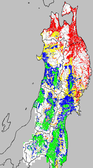 各種文献などを参考にして、草丈・根の伸長に関する限界温度を平均気温で13℃と設定し、13℃以上については1℃刻みで表示します。過去7日の移動平均値で示す。草丈や根の伸長が遅延すると予想される地域を監視するものです。