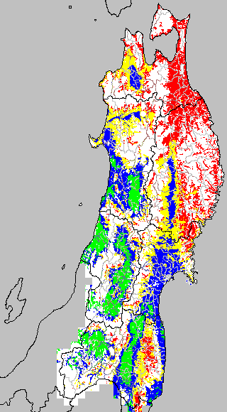 安全作期の策定にある気温指標のうち、中苗・成苗移植の安全早限日の気温指標13.0℃を用いて表示しています。13.0℃以下については1℃刻みで表示し、可能域がどのように推移するかをみるものです。