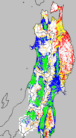 安全作期の策定にある気温指標のうち、中苗・成苗移植の安全早限日の気温指標13.0℃を用いて表示しています。13.0℃以下については1℃刻みで表示し、可能域がどのように推移するかをみるものです。