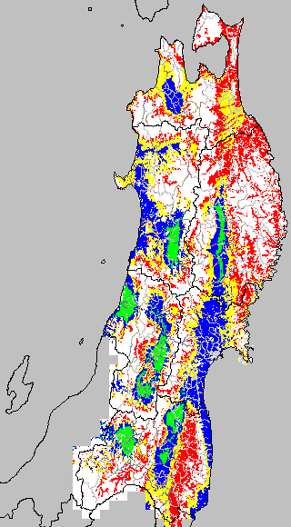 各種文献などを参考にして、草丈・根の伸長に関する限界温度を平均気温で13℃と設定し、13℃以上については1℃刻みで表示します。過去7日の移動平均値で示す。草丈や根の伸長が遅延すると予想される地域を監視するものです。