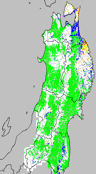 各種文献などを参考にして、草丈・根の伸長に関する限界温度を平均気温で13℃と設定し、13℃以上については1℃刻みで表示します。過去7日の移動平均値で示す。草丈や根の伸長が遅延すると予想される地域を監視するものです。
