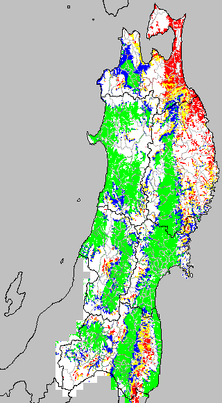 各種文献などを参考にして、分げつ形成に関する限界温度を平均気温で15℃と設定し、15℃以上については1℃刻みで表示します。過去7日の移動平均値で示す。分げつの形成が遅延すると予想される地域を監視するものです。