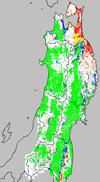 各種文献などを参考にして、分げつ形成に関する限界温度を平均気温で15℃と設定し、15℃以上については1℃刻みで表示します。過去7日の移動平均値で示す。分げつの形成が遅延すると予想される地域を監視するものです。
