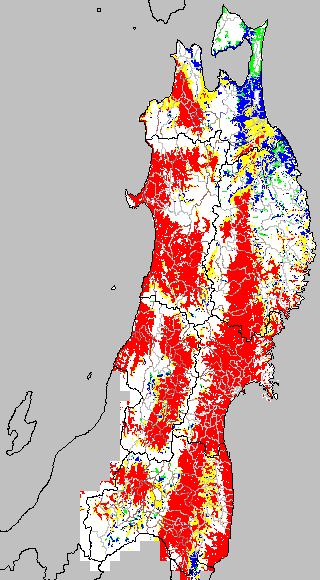 安全作期の策定にある気温指標のうち、いもち病蔓延可能日の平均気温指標20.0℃を用いて表示し、20.0℃未満については1℃刻みで表示します。過去7日の移動平均値で示しています。いもち病の蔓延可能域を監視するものです。葉いもち発生予察メッシュと併せてご覧ください。