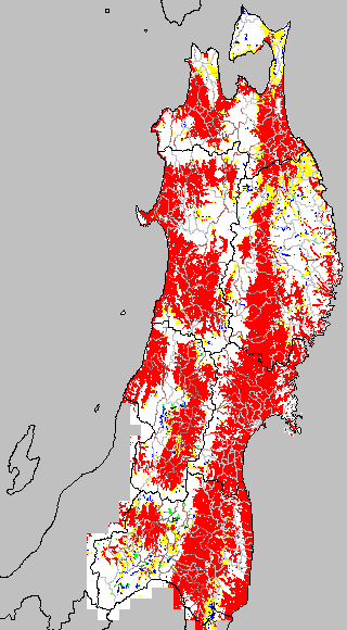 安全作期の策定にある気温指標のうち、いもち病蔓延可能日の平均気温指標20.0℃を用いて表示し、20.0℃未満については1℃刻みで表示します。過去7日の移動平均値で示しています。いもち病の蔓延可能域を監視するものです。葉いもち発生予察メッシュと併せてご覧ください。