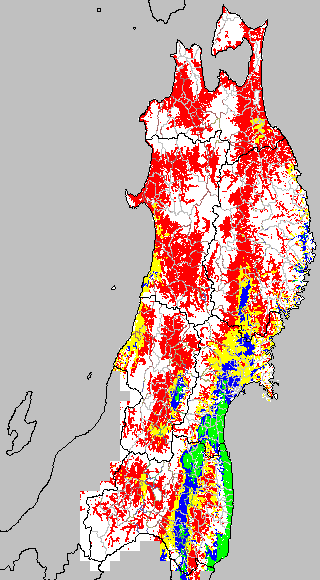 安全作期の策定にある気温指標のうち、中苗・成苗移植の安全早限日の気温指標13.0℃を用いて表示しています。13.0℃以下については1℃刻みで表示し、可能域がどのように推移するかをみるものです。