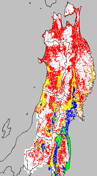 安全作期の策定にある気温指標のうち、乾田直播の安全早限日の気温指標13.5℃を用いて表示しています。13.5℃以下については1℃刻みで表示し、可能域がどのように推移するかをみるものです。