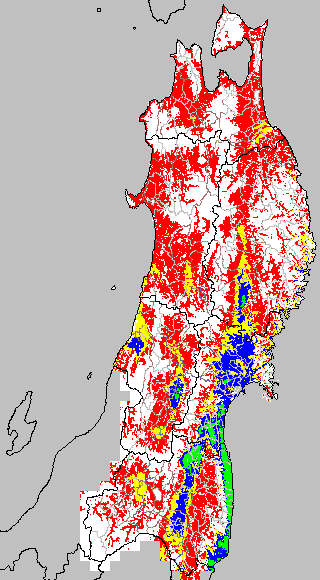 各種文献などを参考にして、分げつ形成に関する限界温度を平均気温で15℃と設定し、15℃以上については1℃刻みで表示します。過去7日の移動平均値で示す。分げつの形成が遅延すると予想される地域を監視するものです。