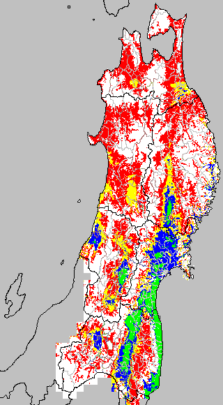 各種文献などを参考にして、分げつ形成に関する限界温度を平均気温で15℃と設定し、15℃以上については1℃刻みで表示します。過去7日の移動平均値で示す。分げつの形成が遅延すると予想される地域を監視するものです。
