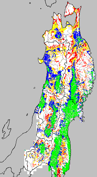 各種文献などを参考にして、草丈・根の伸長に関する限界温度を平均気温で13℃と設定し、13℃以上については1℃刻みで表示します。過去7日の移動平均値で示す。草丈や根の伸長が遅延すると予想される地域を監視するものです。