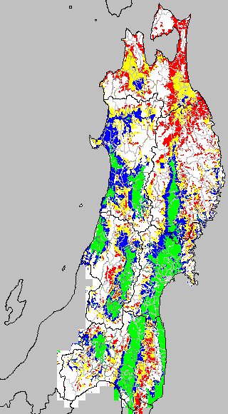 各種文献などを参考にして、草丈・根の伸長に関する限界温度を平均気温で13℃と設定し、13℃以上については1℃刻みで表示します。過去7日の移動平均値で示す。草丈や根の伸長が遅延すると予想される地域を監視するものです。