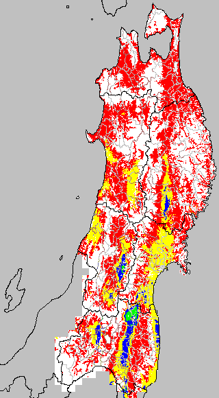 各種文献などを参考にして、分げつ形成に関する限界温度を平均気温で15℃と設定し、15℃以上については1℃刻みで表示します。過去7日の移動平均値で示す。分げつの形成が遅延すると予想される地域を監視するものです。
