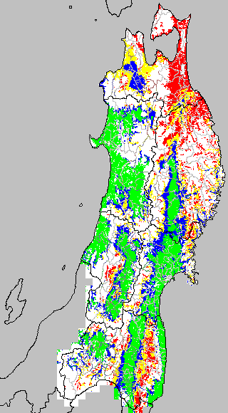 各種文献などを参考にして、草丈・根の伸長に関する限界温度を平均気温で13℃と設定し、13℃以上については1℃刻みで表示します。過去7日の移動平均値で示す。草丈や根の伸長が遅延すると予想される地域を監視するものです。