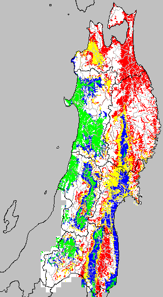 各種文献などを参考にして、草丈・根の伸長に関する限界温度を平均気温で13℃と設定し、13℃以上については1℃刻みで表示します。過去7日の移動平均値で示す。草丈や根の伸長が遅延すると予想される地域を監視するものです。