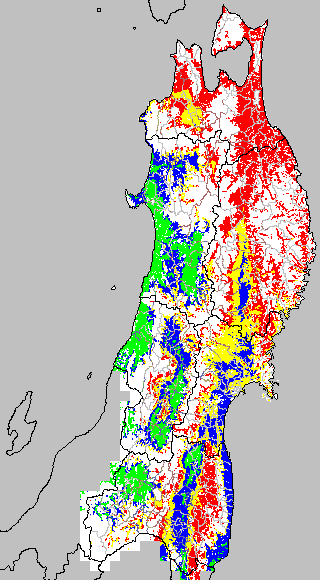 各種文献などを参考にして、草丈・根の伸長に関する限界温度を平均気温で13℃と設定し、13℃以上については1℃刻みで表示します。過去7日の移動平均値で示す。草丈や根の伸長が遅延すると予想される地域を監視するものです。