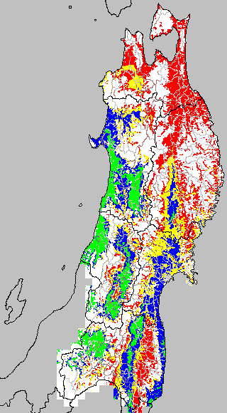 各種文献などを参考にして、草丈・根の伸長に関する限界温度を平均気温で13℃と設定し、13℃以上については1℃刻みで表示します。過去7日の移動平均値で示す。草丈や根の伸長が遅延すると予想される地域を監視するものです。