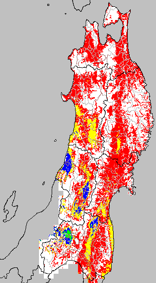 各種文献などを参考にして、分げつ形成に関する限界温度を平均気温で15℃と設定し、15℃以上については1℃刻みで表示します。過去7日の移動平均値で示す。分げつの形成が遅延すると予想される地域を監視するものです。