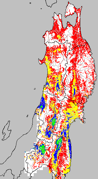 各種文献などを参考にして、分げつ形成に関する限界温度を平均気温で15℃と設定し、15℃以上については1℃刻みで表示します。過去7日の移動平均値で示す。分げつの形成が遅延すると予想される地域を監視するものです。