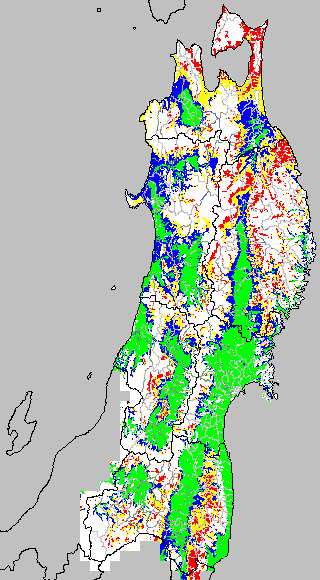 各種文献などを参考にして、分げつ形成に関する限界温度を平均気温で15℃と設定し、15℃以上については1℃刻みで表示します。過去7日の移動平均値で示す。分げつの形成が遅延すると予想される地域を監視するものです。