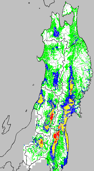 安全作期の策定にある気温指標のうち、いもち病蔓延可能日の平均気温指標20.0℃を用いて表示し、20.0℃未満については1℃刻みで表示します。過去7日の移動平均値で示しています。いもち病の蔓延可能域を監視するものです。葉いもち発生予察メッシュと併せてご覧ください。