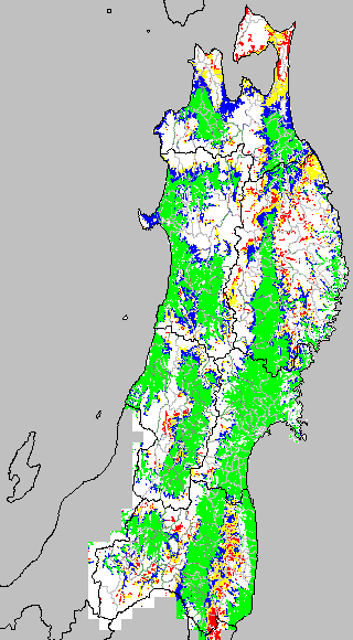 各種文献などを参考にして、分げつ形成に関する限界温度を平均気温で15℃と設定し、15℃以上については1℃刻みで表示します。過去7日の移動平均値で示す。分げつの形成が遅延すると予想される地域を監視するものです。