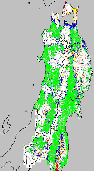 各種文献などを参考にして、分げつ形成に関する限界温度を平均気温で15℃と設定し、15℃以上については1℃刻みで表示します。過去7日の移動平均値で示す。分げつの形成が遅延すると予想される地域を監視するものです。