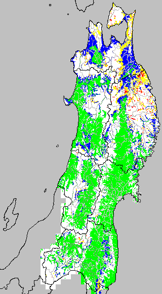 各種文献などを参考にして、分げつ形成に関する限界温度を平均気温で15℃と設定し、15℃以上については1℃刻みで表示します。過去7日の移動平均値で示す。分げつの形成が遅延すると予想される地域を監視するものです。