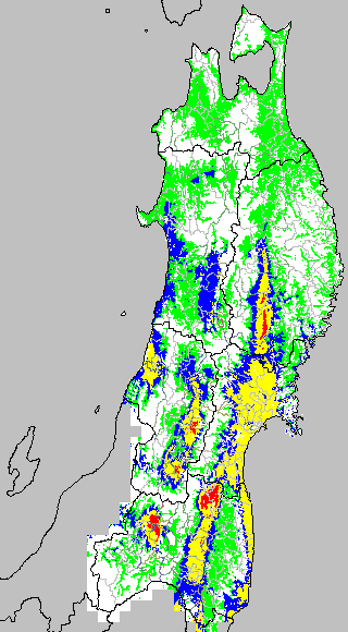 安全作期の策定にある気温指標のうち、いもち病蔓延可能日の平均気温指標20.0℃を用いて表示し、20.0℃未満については1℃刻みで表示します。過去7日の移動平均値で示しています。いもち病の蔓延可能域を監視するものです。葉いもち発生予察メッシュと併せてご覧ください。