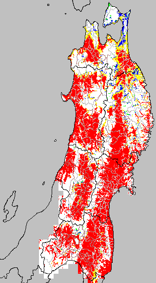 安全作期の策定にある気温指標のうち、いもち病蔓延可能日の平均気温指標20.0℃を用いて表示し、20.0℃未満については1℃刻みで表示します。過去7日の移動平均値で示しています。いもち病の蔓延可能域を監視するものです。葉いもち発生予察メッシュと併せてご覧ください。