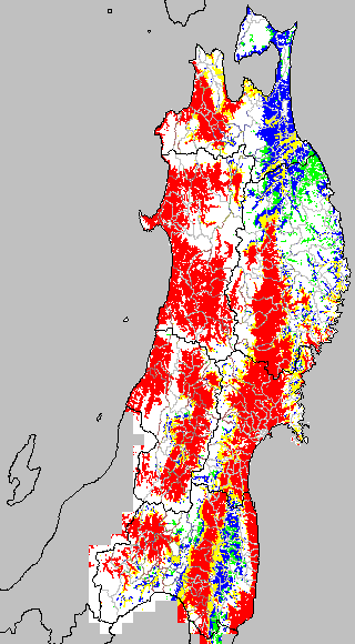 安全作期の策定にある気温指標のうち、いもち病蔓延可能日の平均気温指標20.0℃を用いて表示し、20.0℃未満については1℃刻みで表示します。過去7日の移動平均値で示しています。いもち病の蔓延可能域を監視するものです。葉いもち発生予察メッシュと併せてご覧ください。