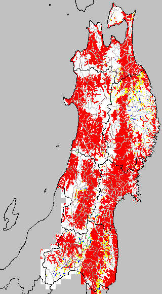 安全作期の策定にある気温指標のうち、いもち病蔓延可能日の平均気温指標20.0℃を用いて表示し、20.0℃未満については1℃刻みで表示します。過去7日の移動平均値で示しています。いもち病の蔓延可能域を監視するものです。葉いもち発生予察メッシュと併せてご覧ください。