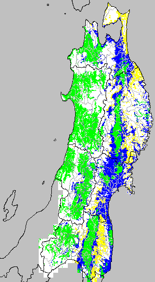 開花・受精期も低温に弱い時期です。文献等を参考に開花・受精に不適な地域の移り変わりを、最高気温を用いて前5日間の移動平均値で図示します。