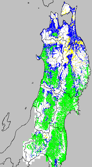 開花・受精期も低温に弱い時期です。文献等を参考に開花・受精に不適な地域の移り変わりを、最高気温を用いて前5日間の移動平均値で図示します。