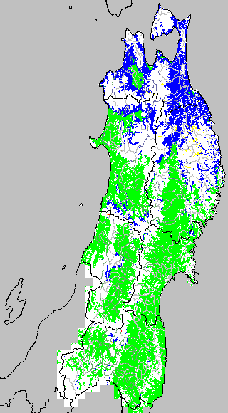 低温障害の発生の基準温度として、最低気温17℃が一般によく使われます。それを基に、極端な低温が来た地域の移り変わりを、最低気温の前3日の移動平均値で図示します。