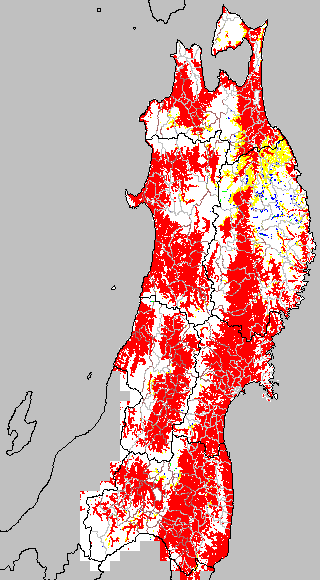 安全作期の策定にある気温指標のうち、いもち病蔓延可能日の平均気温指標20.0℃を用いて表示し、20.0℃未満については1℃刻みで表示します。過去7日の移動平均値で示しています。いもち病の蔓延可能域を監視するものです。葉いもち発生予察メッシュと併せてご覧ください。