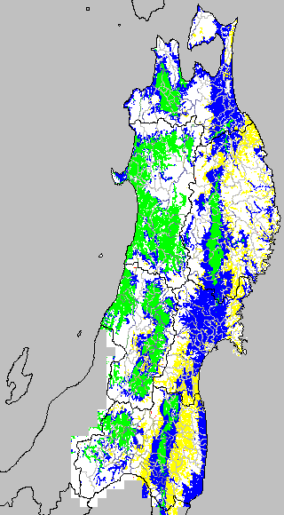開花・受精期も低温に弱い時期です。文献等を参考に開花・受精に不適な地域の移り変わりを、最高気温を用いて前5日間の移動平均値で図示します。