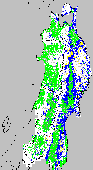 開花・受精期も低温に弱い時期です。文献等を参考に開花・受精に不適な地域の移り変わりを、最高気温を用いて前5日間の移動平均値で図示します。