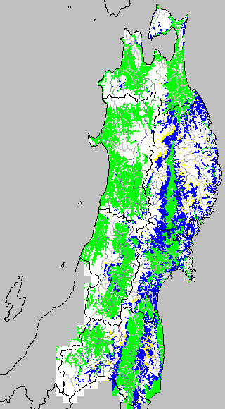 開花・受精期も低温に弱い時期です。文献等を参考に開花・受精に不適な地域の移り変わりを、最高気温を用いて前5日間の移動平均値で図示します。