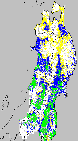 開花・受精期も低温に弱い時期です。文献等を参考に開花・受精に不適な地域の移り変わりを、最高気温を用いて前5日間の移動平均値で図示します。