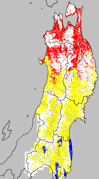 開花・受精期も低温に弱い時期です。文献等を参考に開花・受精に不適な地域の移り変わりを、最高気温を用いて前5日間の移動平均値で図示します。