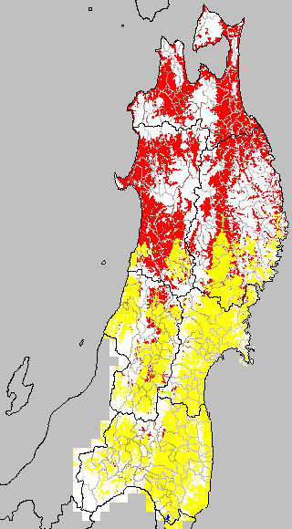 開花・受精期も低温に弱い時期です。文献等を参考に開花・受精に不適な地域の移り変わりを、最高気温を用いて前5日間の移動平均値で図示します。
