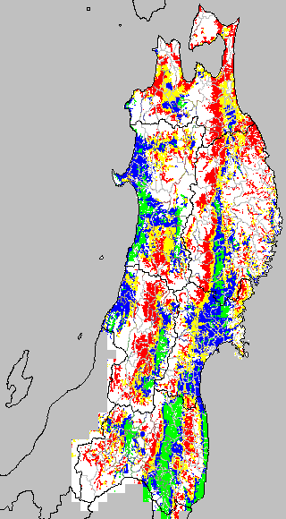 安全作期の策定にある気温指標のうち、中苗・成苗移植の安全早限日の気温指標13.0℃を用いて表示しています。13.0℃以下については1℃刻みで表示し、可能域がどのように推移するかをみるものです。